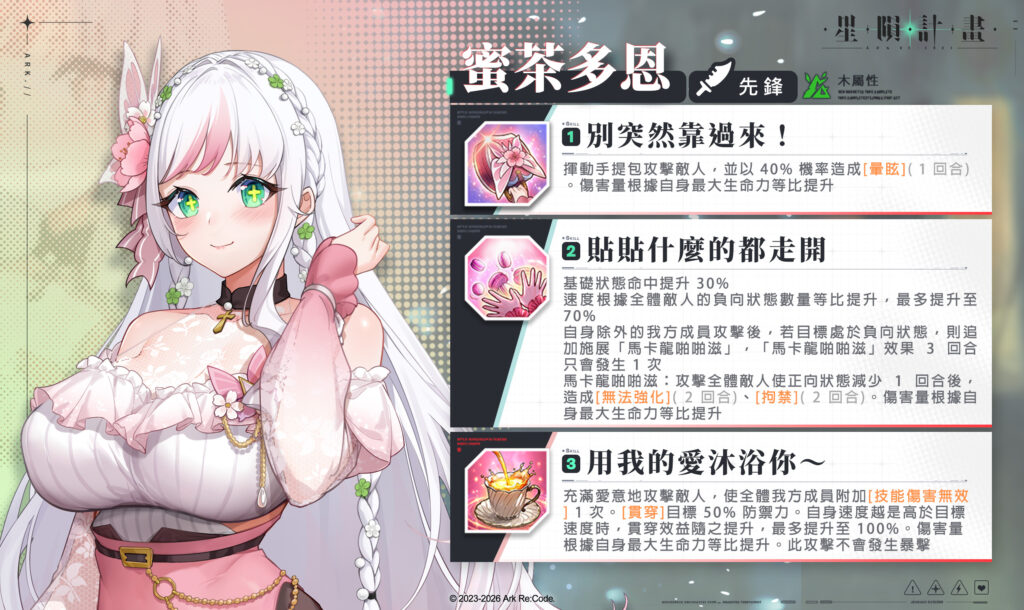 由 Neversoft 發行並於 EROLABS 平台推出的成人手遊《星隕計畫 Ark Re:Code》宣布,於今(4)日釋出全新情人節限定活動「意料之外的情人節」,推出限定團員「蜜茶多恩」與限定羈絆「特製的甜點」,並同步預告農曆新年期間將展開每日免費十連抽與素材掉落加倍等福利活動。